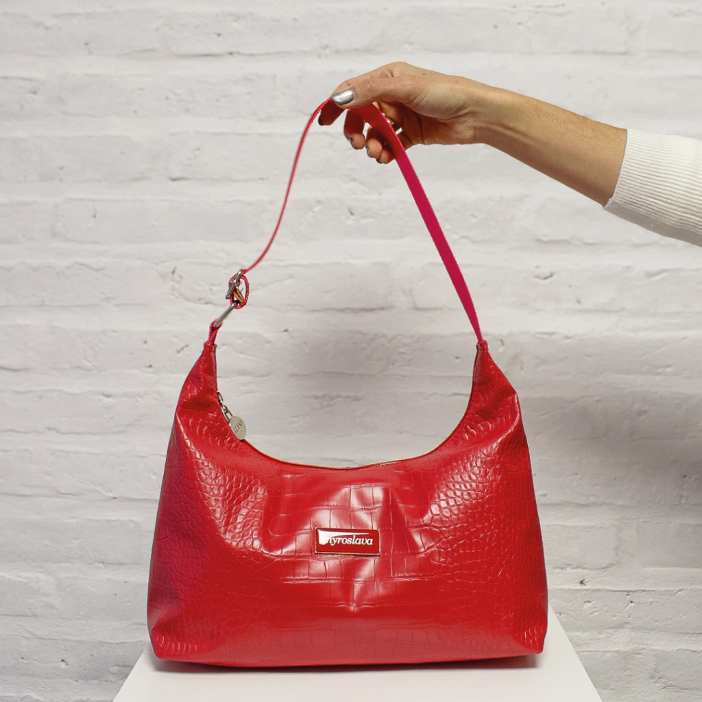 Compacta, canchera. ideal. MARIA llega con un diseño espacioso, en rojo pasión, con correa regulable de cinta para usar al hombro o en la mano. Es el toque moderno y canchero para tu look diario.
