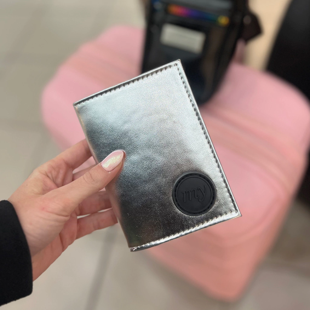 Porta pasaporte y documentos en símil cuero metalizado. Etiqueta MY de PVC. Espacio para tarjetas y pasaporte. Medidas: 10cm x 14cm