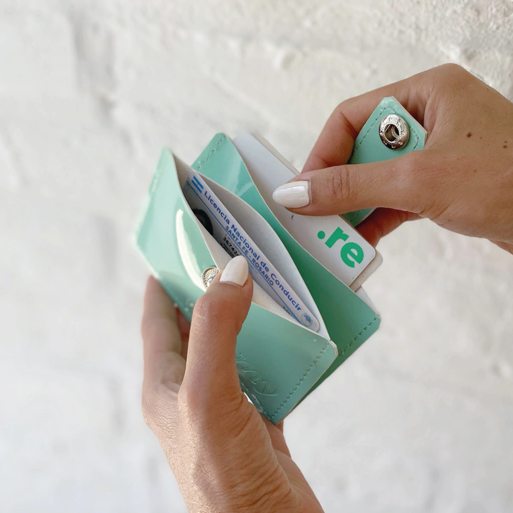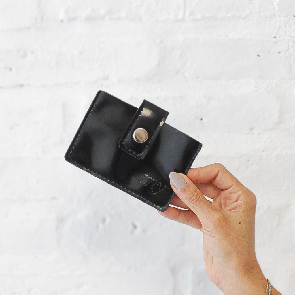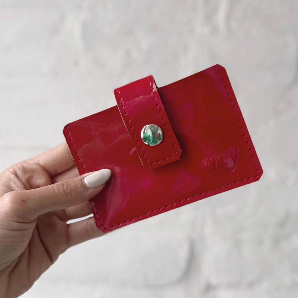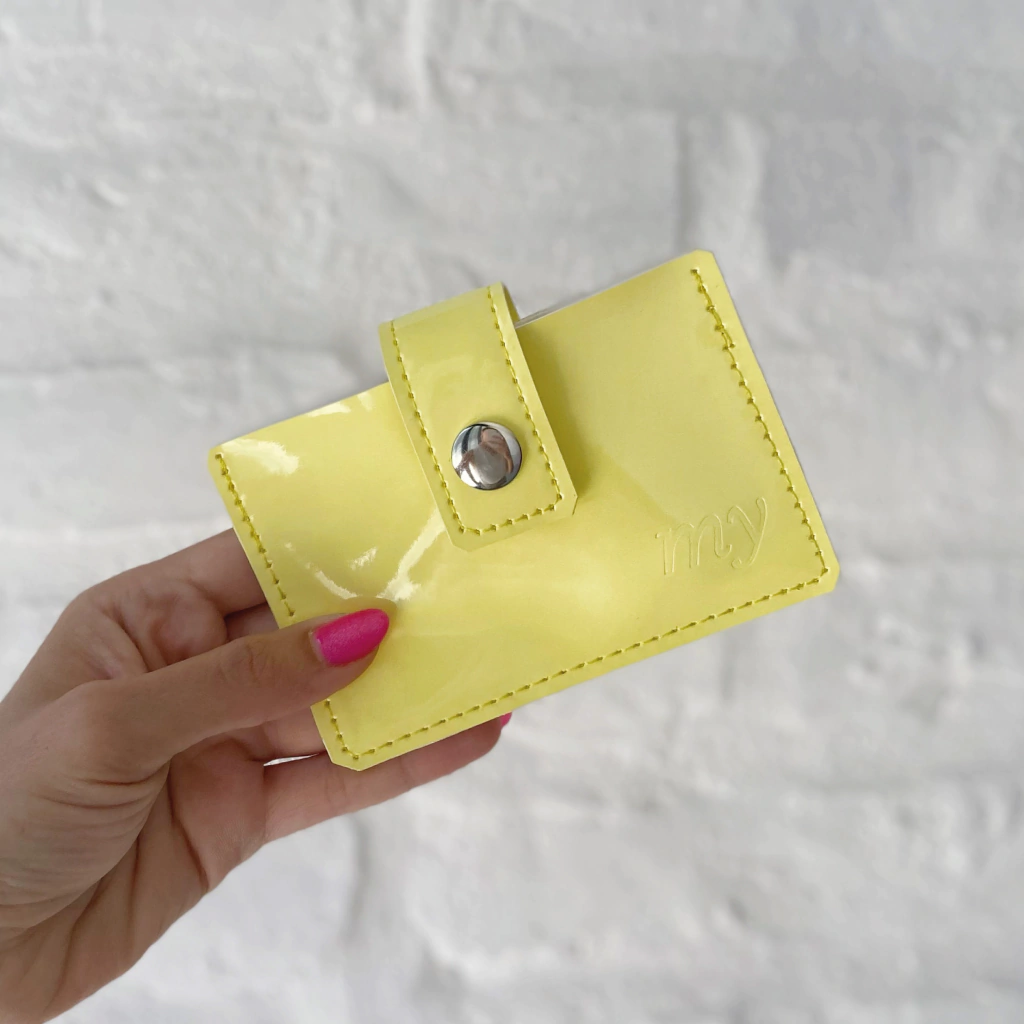 Tarjetero de símil charol. Cuenta con doble cuerpo. Acceso superior. Apertura frontal con broche resorte en niquel. MY grabado en el frente. Medidas: 9cm x 10,5cm